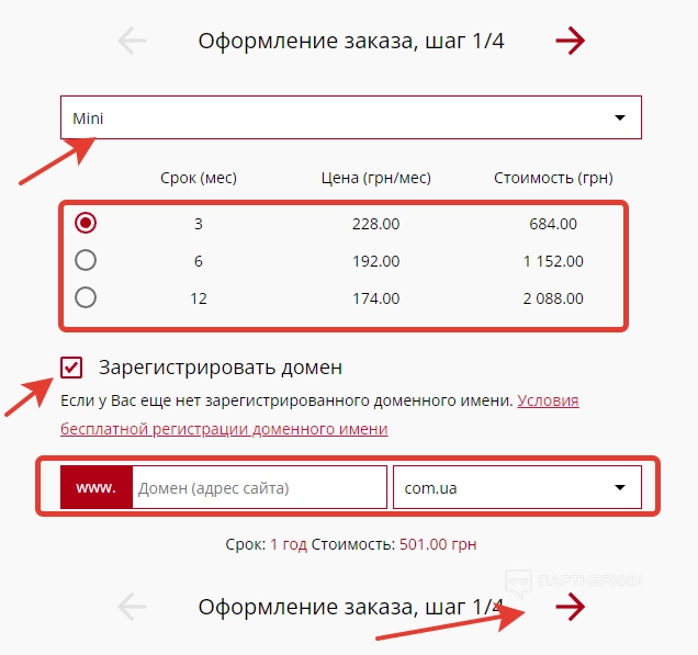 В первом окне нужно выбрать тип хостинга (mini, site, portal) и определиться с тарифов. Далее указываем доменное имя и ставим галочку напротив «Зарегистрировать домен». В конце жмем на стрелочку для перехода на следующую страницу.