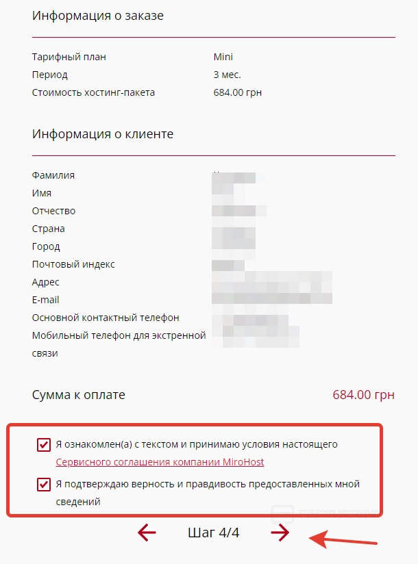 На этой странице будет чек, в котором прописаны все введенные параметры, и стоимость заказа. Если все правильно, даем свое согласие с условиями пользования, подтверждаем верность данных и кликаем на стрелку внизу формы.