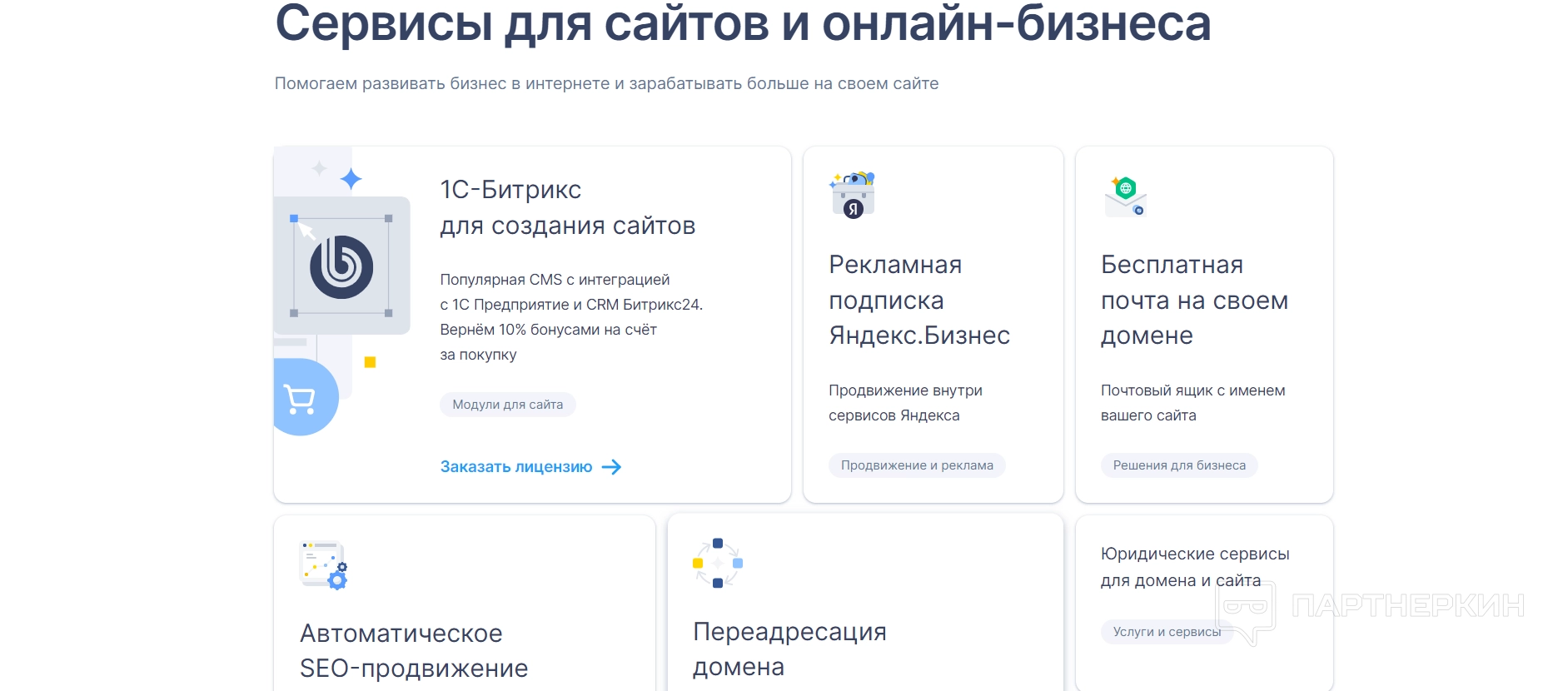 При переходе по кнопке «Заказать» открывается раздел, в котором собрали все дополнительные функции — это продвижение в Яндексе, 1C-Битрикс для создания сайтов, переадресация домена и другие.