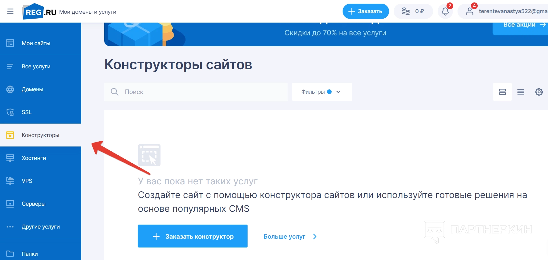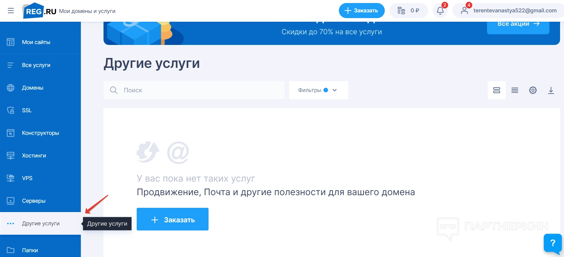 В разделе «Других услуг» можно заказать дополнительные услуги сервиса — например, продвижение домена или создание почты к нему.