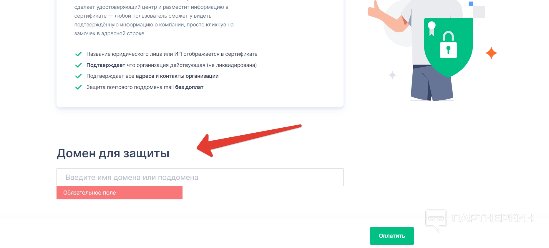 Для того, чтобы купить любой вид сертификата, нужно нажать на кнопку «Купить» и на следующей странице указать свой домен.