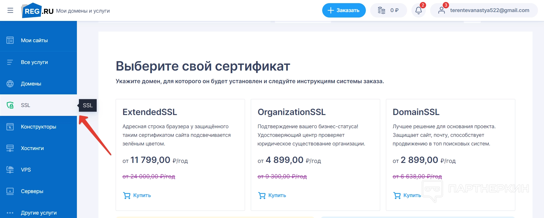 В разделе SSL сервис сразу предлагает на выбор три вида сертификатов — сертификат для бизнеса, базовый сертификат для домена и сертификат, который будет подсвечиваться зеленым при входе на сайт.