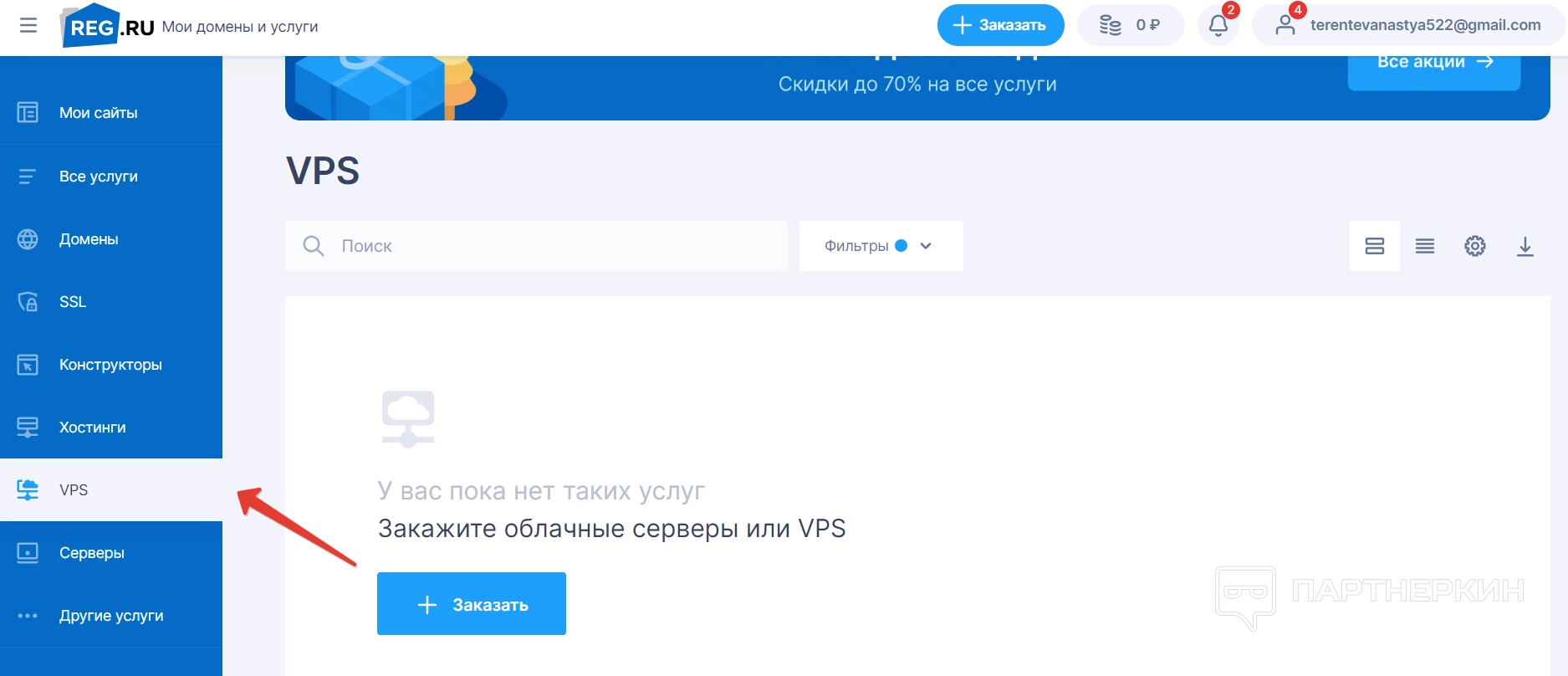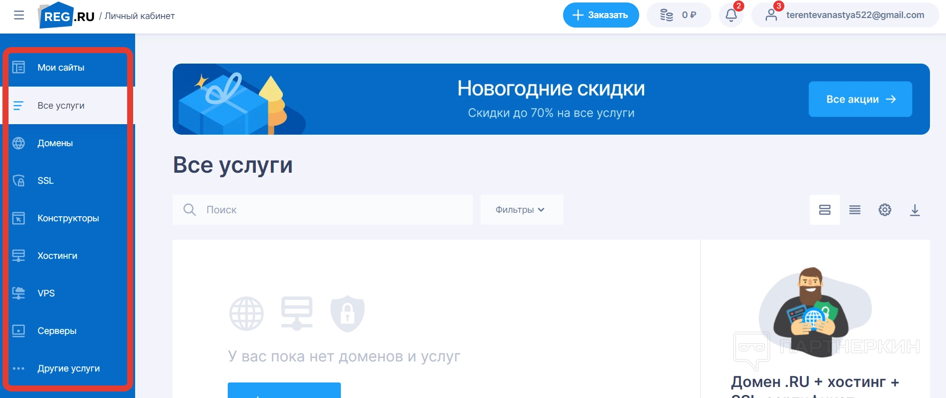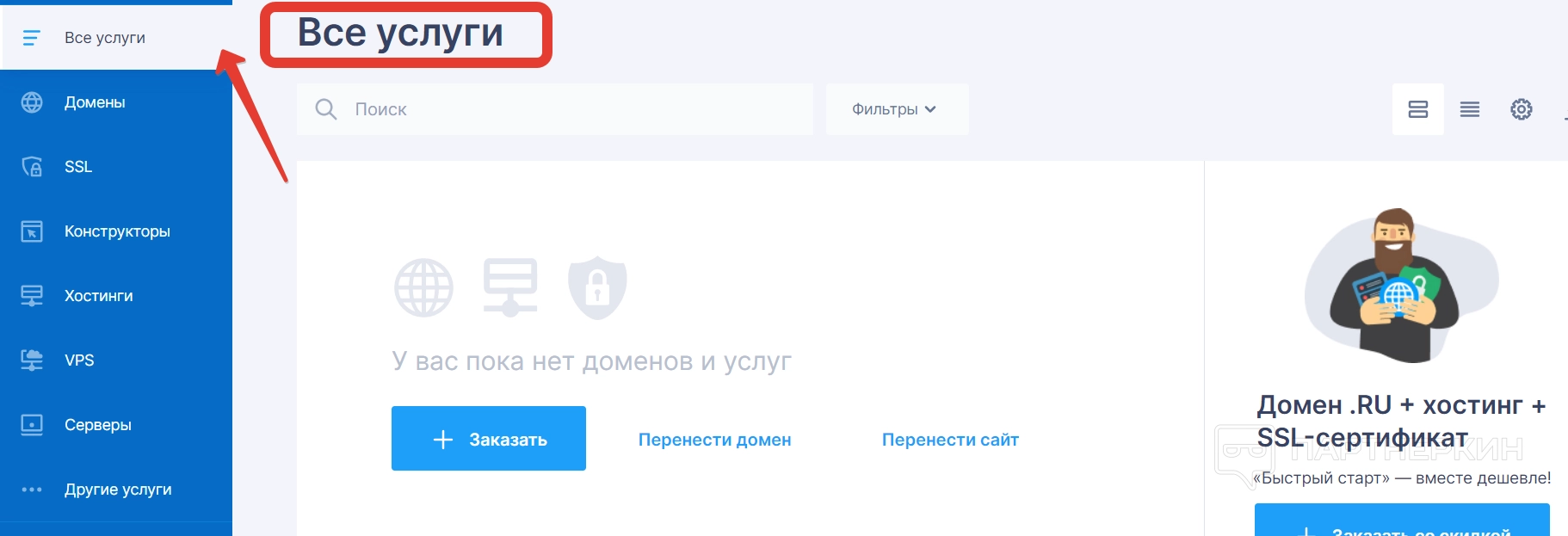 В этом разделе собрали основные услуги сервиса, которые пользователь использовал. Например, если он заказал определенный домен и хостинг к нему, то эта услуга отобразиться в меню.
