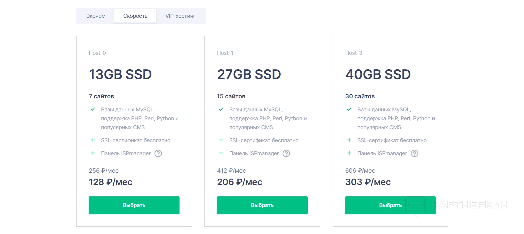 При выборе хостинга дается три варианта тарифов — скоростные, экономные и VIP-хостинги. Внутри каждого из тарифов есть варианта пакетов. Разберем их подробнее.