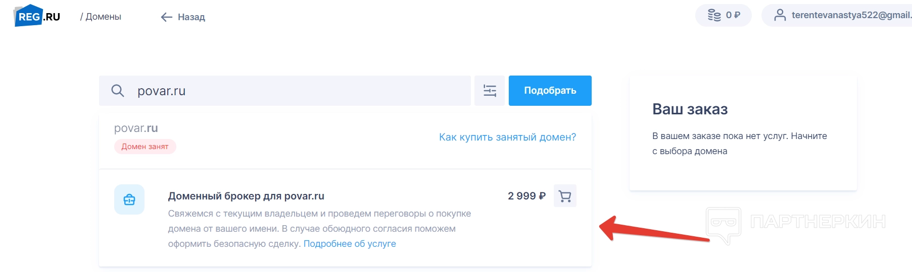 Но если у пользователя есть на примете свой домен, он может ввести его и посмотреть, занят ли он. Например, мы ввели рандомное название и поняли, что домен занят. Сервис предлагает либо альтернативные варианты, либо связаться с владельцем домена и провести переговоры.