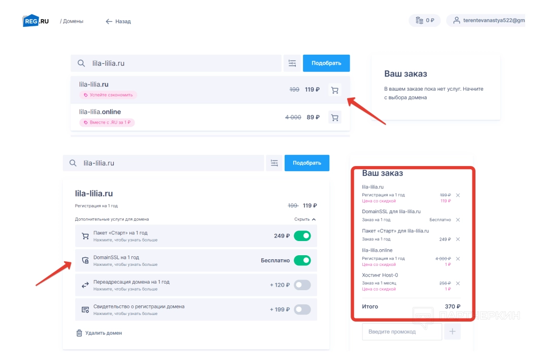 После этого происходит оплата и привязка ко всем вариациям домена — домен.ru, www.домен.ru и mail.домен.ru.