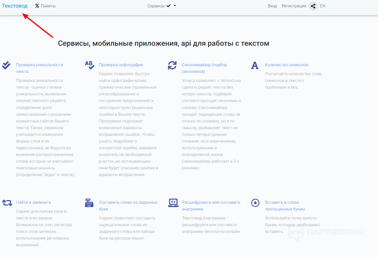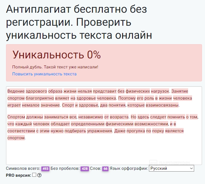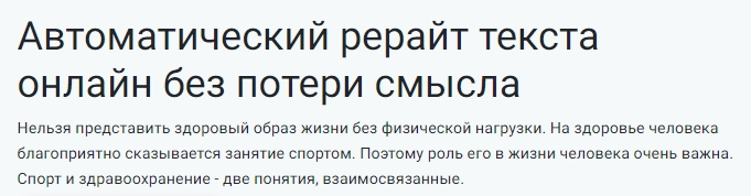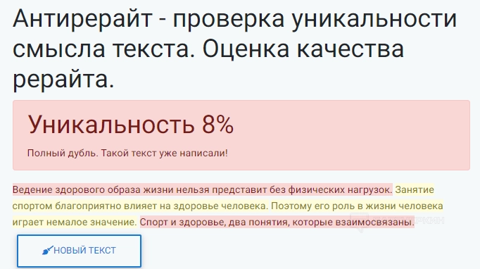 Сервис проверяет текст на антиплагиат. 80% и выше — оптимальный показатель уникальности контента. Если пользователю необходимо улучшить результат, он может воспользоваться другими инструментами площадки — синонимайзером или бесплатным автоматическим рерайтом.