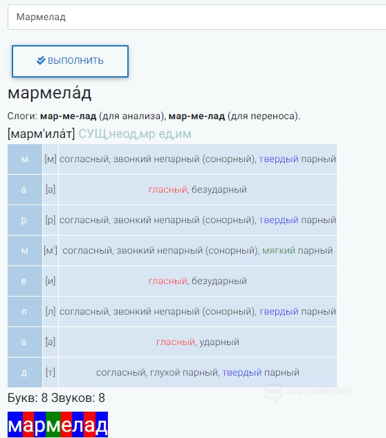 Инструмент выполняет звуко-буквенный (фонетический) разбор слова и записывает транскрипцию. В пустую строку необходимо ввести любое слово и нажать кнопку «Выполнить». Результат может быть следующим: