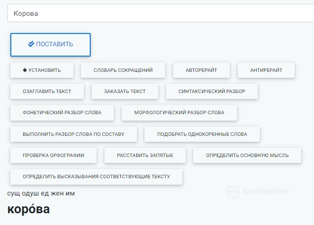 Чтобы воспользоваться инструментом, пользователю нужно просто написать необходимое слово в пустой строке. Для примера пишем слово «корова» и получаем такой результат:
