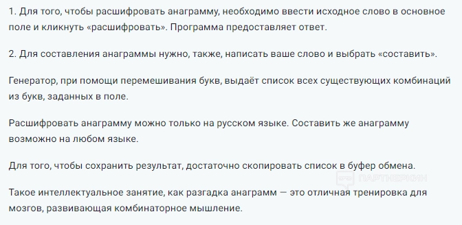 Программа поможет расшифровать или составить анаграмму. Инструкция по использованию: