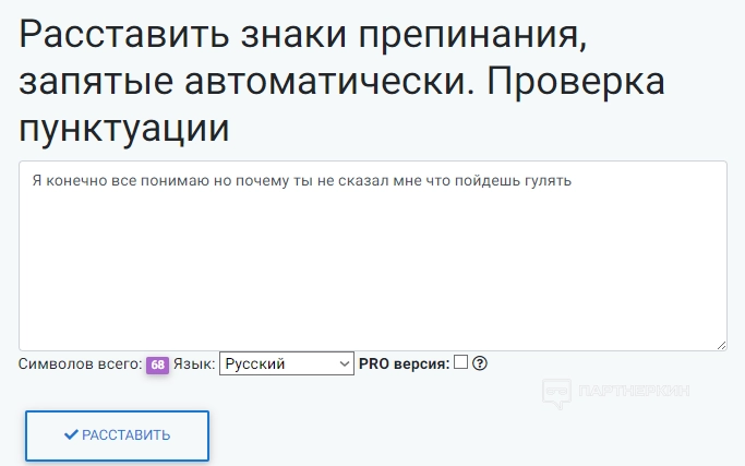 Инструмент помогает расставить заглавные буквы, запятые и другие знаки препинания на нескольких языках. Для тестирования сервиса введем предложения с пунктуационными ошибками.