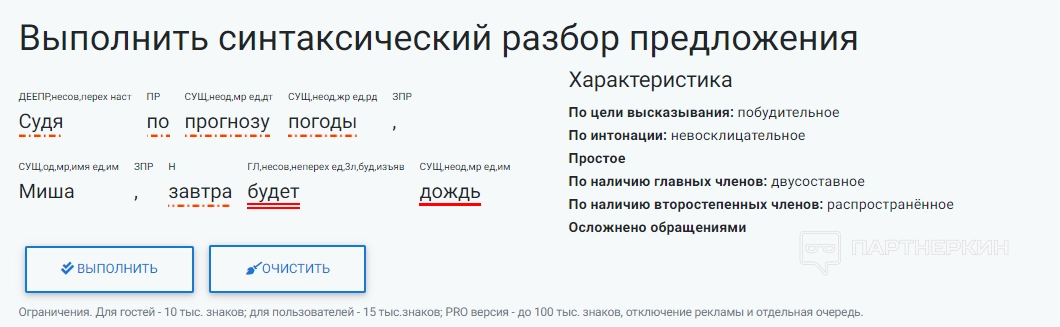 Инструмент необходим для характеристики предложения по структуре, типу, членам предложения и частям речи. Инструмент больше предназначен для школьников и студентов, которые на практике часто сталкиваются с подобными заданиями.