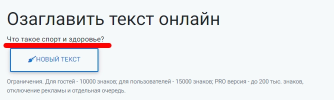 Инструмент помогает придумать заглавие, название и заголовок чему-либо (книге, статье, сочинению, стихотворению и так далее). Чтобы воспользоваться сервисом, в пустое поле нужно вставить текст — программа его проанализирует и предложит вариант. Для теста снова возьмем отрывок про здоровый образ жизни.
