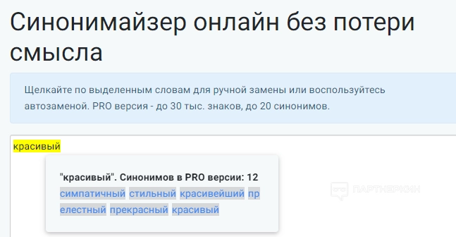 Инструмент подбирает синонимы к словам. Сервис учитывает контекст использования слов и старается предложить варианты без потери смысла. В поиске мы ввели слово «красивый». Площадка подобрала следующие синонимы: