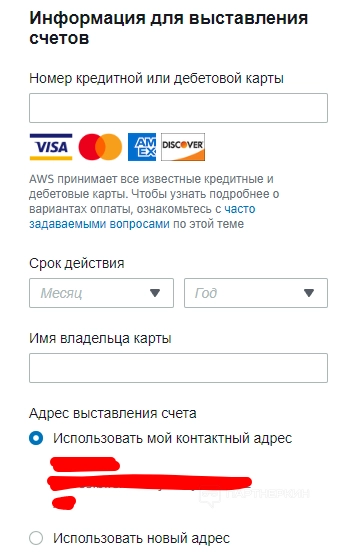 Далее пользователю необходимо ввести номер кредитной или дебетовой карты, адрес выставления счета.