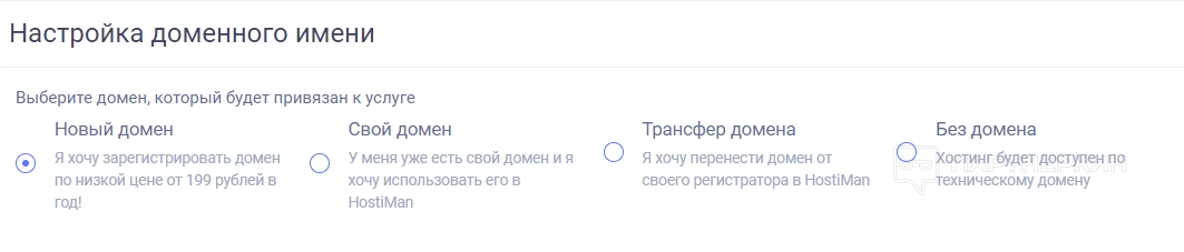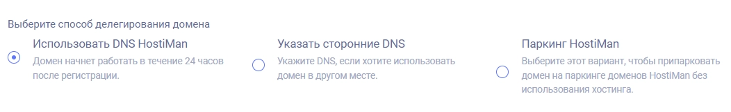 - Паркинг HostiMan. Рекомендуется выбрать этот вариант, чтобы разместить домен на паркинге доменов HostiMan без использования хостинга.
