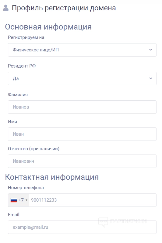 Пользователь попадет на страницу «Профиль регистрации домена». Здесь нужно заполнить основную и контактную информацию: