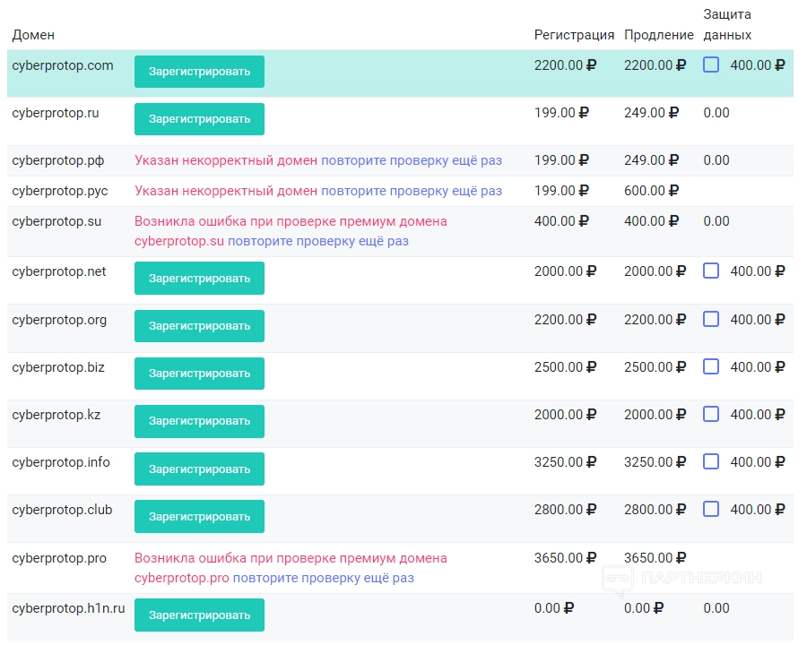 В течение нескольких секунд отобразится список свободных доменов. Для регистрации понравившегося варианта нужно кликнуть «Зарегистрировать».