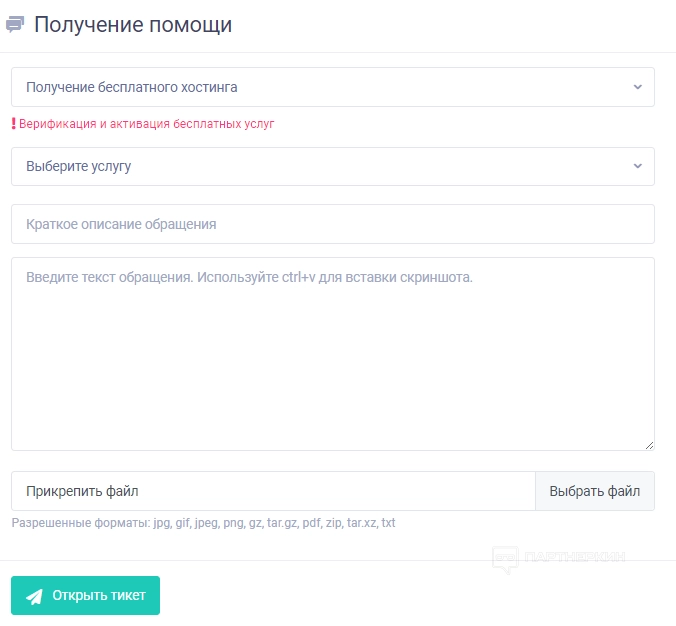 После создания обращения необходимо нажать кнопку «Открыть тикет».