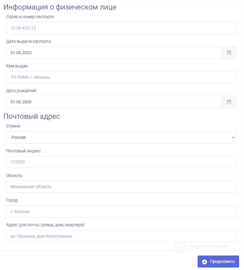 Еще потребуется указать информацию о физическом лице и почтовый адрес: