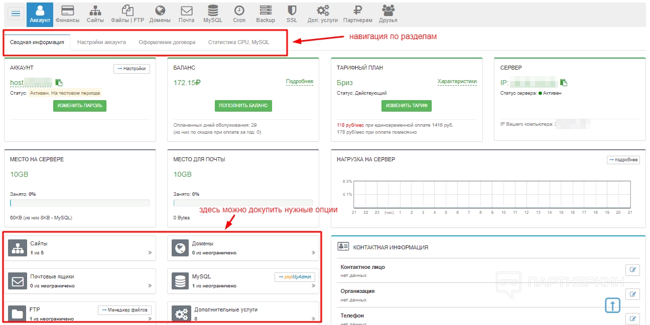 - Аккаунт . Основные данные о личном кабинете, настройка безопасности, отслеживание нагрузки на сервер, MySQL и CPU.