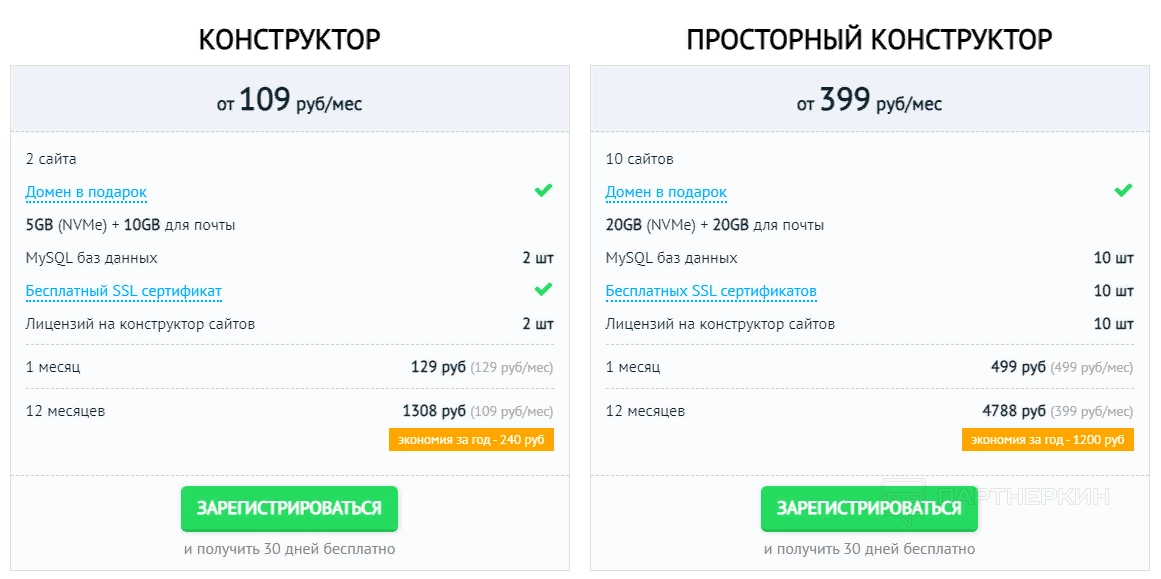 - «Просторный конструктор», от 399 руб/месяц – 10 сайтов, 20 ГБ дискового пространства (NVMe, 20 ГБ для почты, 10 баз данных, 10 SSL-сертификатов, 10 лицензий на конструктор.