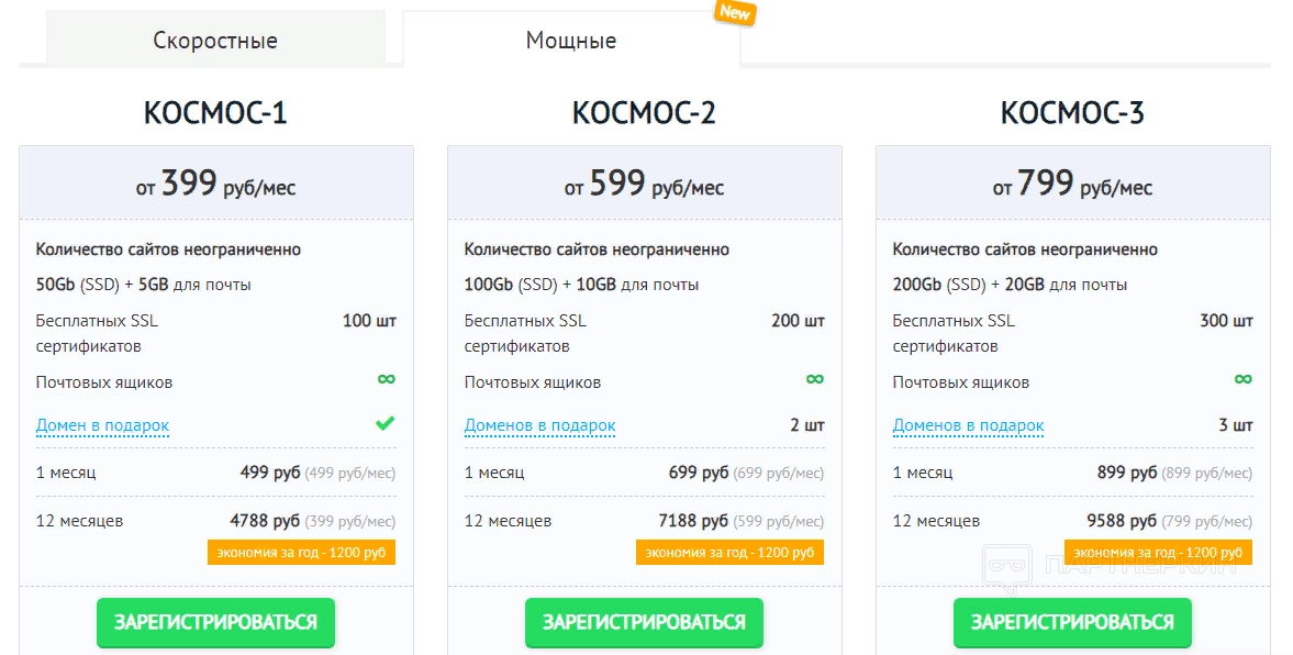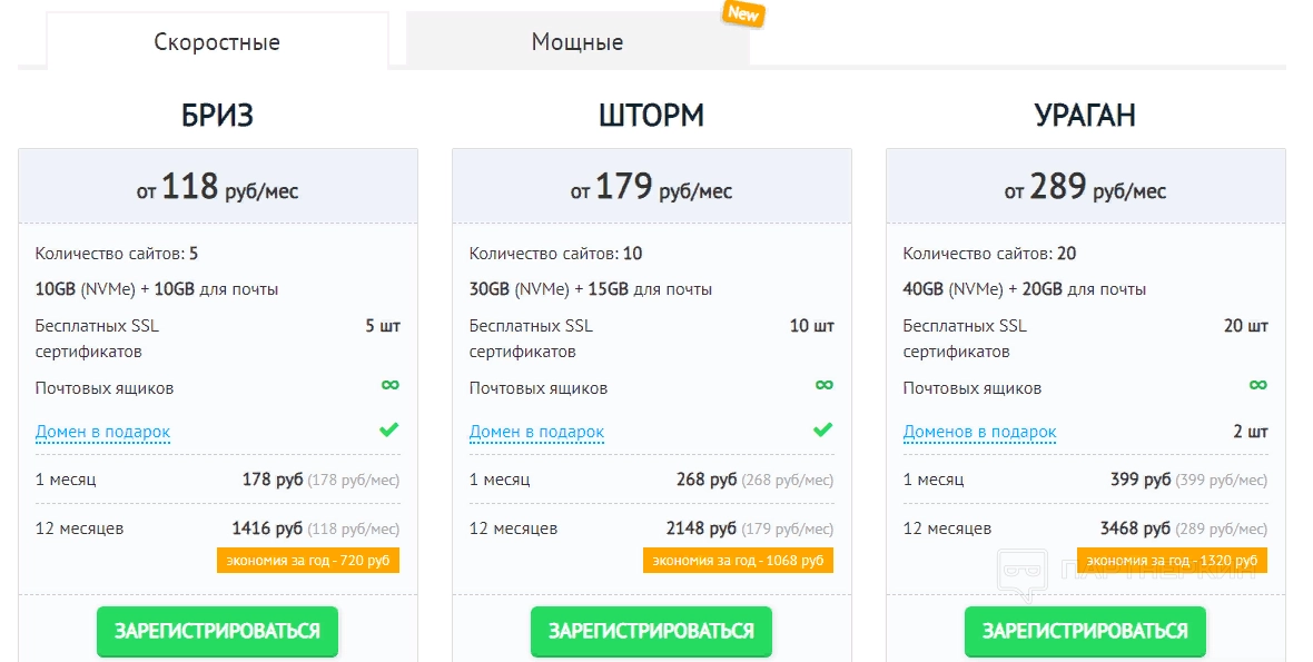 Тарифная линейка «Мощные» предлагает неограниченное количество сайтов на каждом плане и повышенное количество сертификатов – от 100 до 300 штук. Сервера работают на дисках SSD.