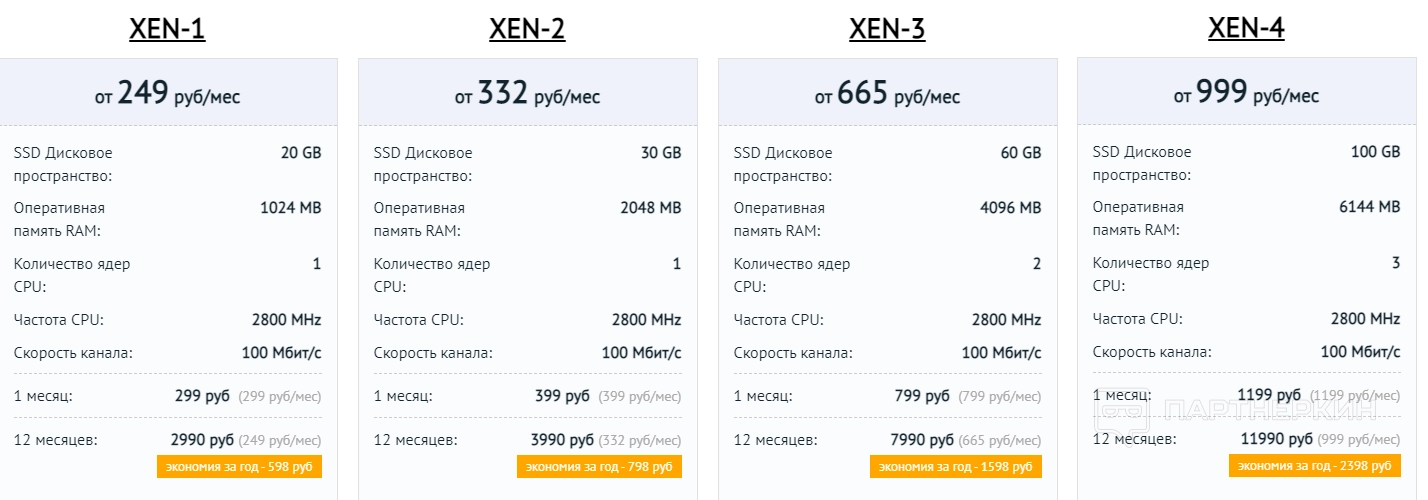 Тарифные планы различаются объемом дискового пространства, RAM, количеством ядер и частотой CPU. На всех вариантах обеспечиваются следующие возможности: