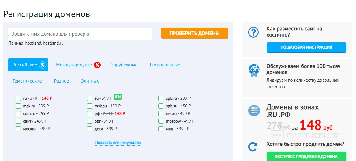 Сервис предлагает приобрести российские, международные, региональные и зарубежные домены стоимостью от 148 рублей. Перед покупкой можно проверить доменное имя на доступность и узнать данные владельца.