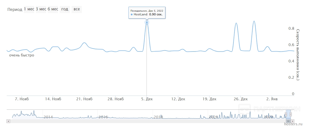 Что касается проверки скорости, HotLand также показывает высокие результаты с наиболее частым показателем «очень быстро». За ноябрь-декабрь 2022 самой медленной скоростью загрузки файла с их хостинга были 0.90 и 0.89 секунд.