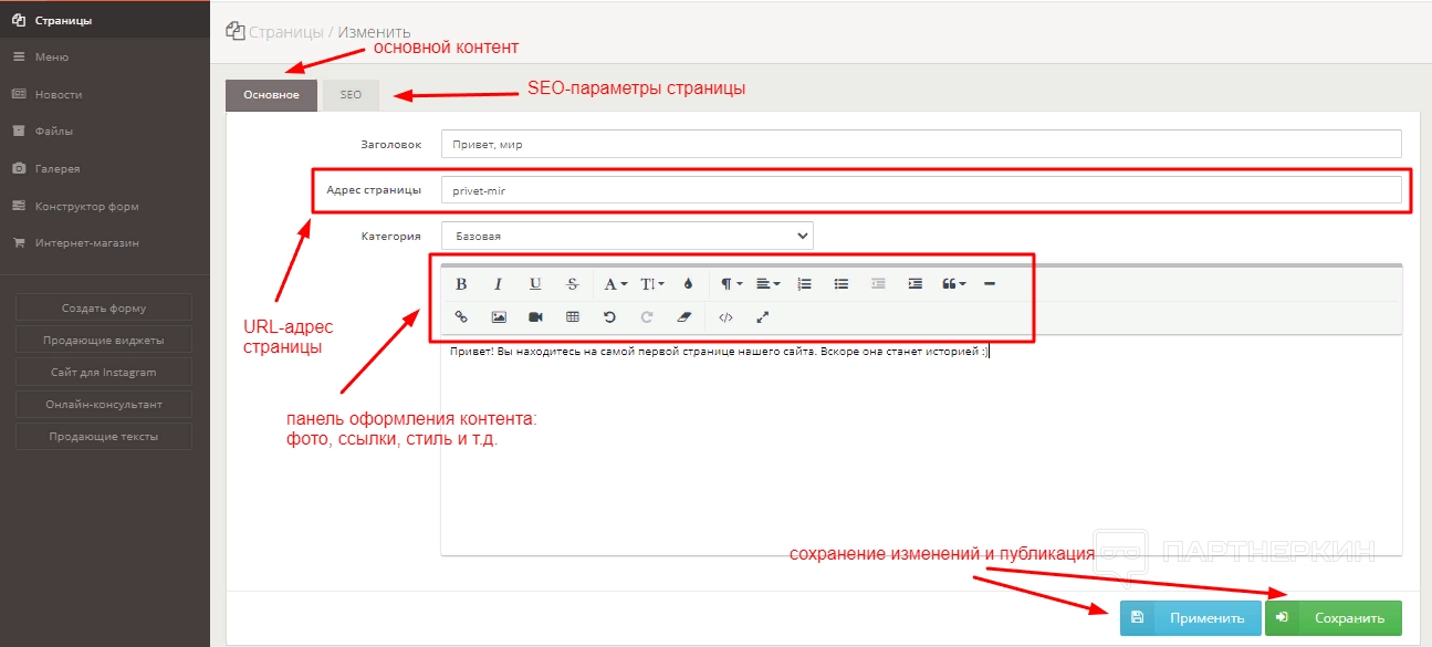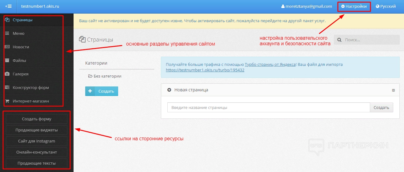 - Страницы – добавление статичных страниц с текстом и изображениями.
