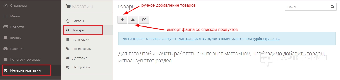 Добавьте продукты в разделе «Товары». Список ассортимента можно оформить вручную или загрузить YML-файл из Яндекс Маркета. Для импорта файла щелкните по иконке со стрелкой, для ручного добавления – по плюсику.