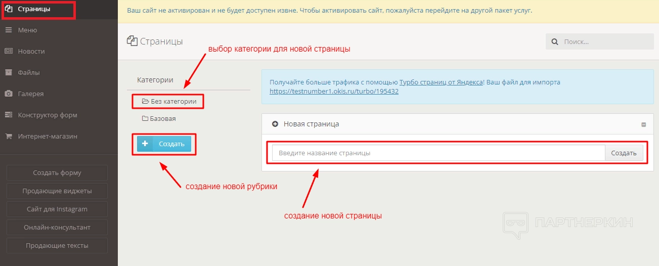 Чтобы добавить страницы и рубрики, воспользуйтесь соответствующим разделом слева. Для начала требуется открыть рубрику, в которую будут публиковаться статьи. Кликните «Создать» в блоке «Категории», введите название и щелкните по галочке. Чтобы создать статью, в блоке «Новая страница» введите название и кликните «Создать».