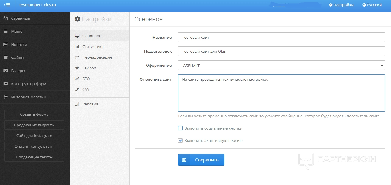 - Основное . Здесь устанавливаются главные настройки ресурса: название, подзаголовок, стиль оформления админки, текст для временного отключения сайта, включение адаптивной версии для просмотра на мобильных телефонах и планшетах.