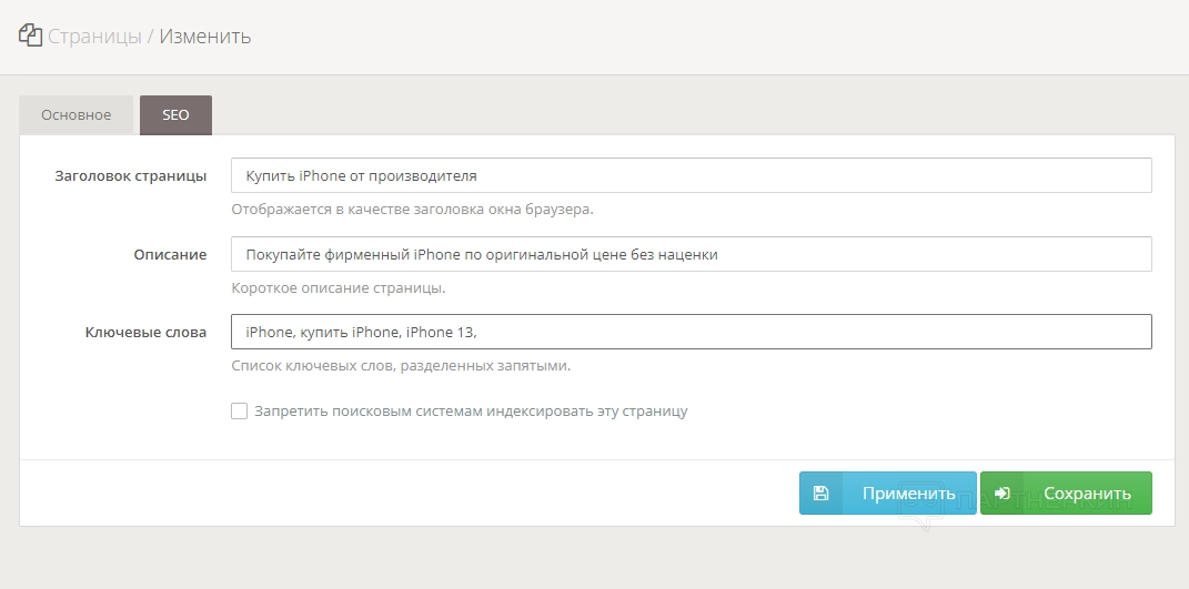 В разделе SEO добавляются ключевые слова, краткое описание и другие параметры для улучшения индексации в поисковых системах. После публикации страницы можно изменить HTML-код и сделать ее стартовой.