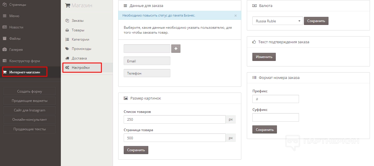 Рассмотрим кратко, как заполнить интернет-магазин. Для начала требуется указать основные настройки. Это делается в соответствующем разделе. Установите, какие данные должен указать покупатель, и основную валюту сайта. Можно также указать единый размер картинок в списке товаров и текст подтверждения покупки.