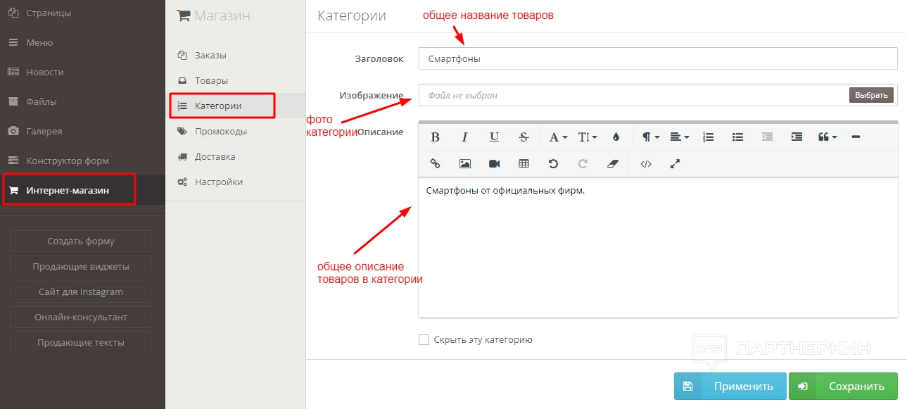 После этого нужно создать категории. В соответствующем разделе нажмите кнопку «Добавить» и укажите название и описание содержащихся в рубрике товаров. Можно установить фото по умолчанию для всей категории.