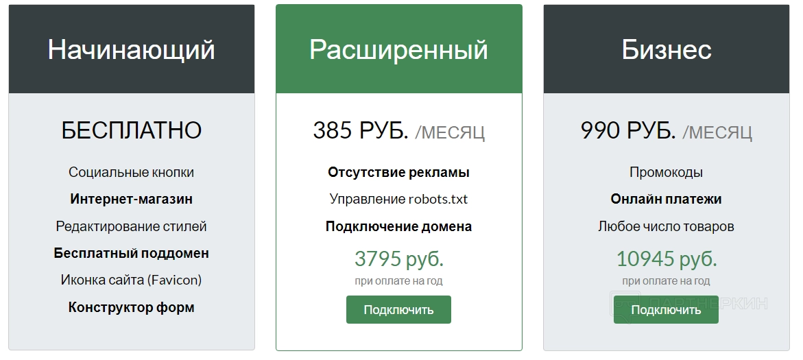 Бесплатный период не ограничен относительно времени, но в этом случае созданный сайт не будет виден в поисковиках. «Расширенный» открывает ресурс для индексации, разрешает управлять файлом robots и подключить личный домен. «Бизнес» включает в себя промокоды, онлайн-платежи и любое число товаров в интернет-магазине.