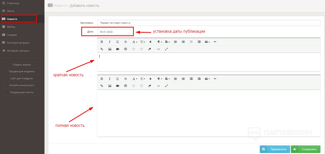 Также на сайт можно добавлять новости. Они автоматически публикуются в новостную рубрику, которую нельзя изменить. Для добавления нового контента откройте раздел «Новости». В редакторе можно указать дату публикации и добавить краткое и полное описание новостной повестки.