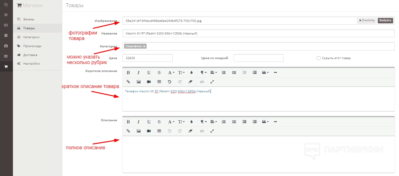 - Категории . Создание рубрик для добавляемых продуктов. Категории не пересекаются с рубриками на остальном сайте для новостей и страниц.