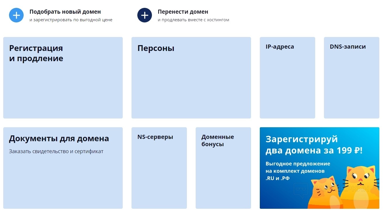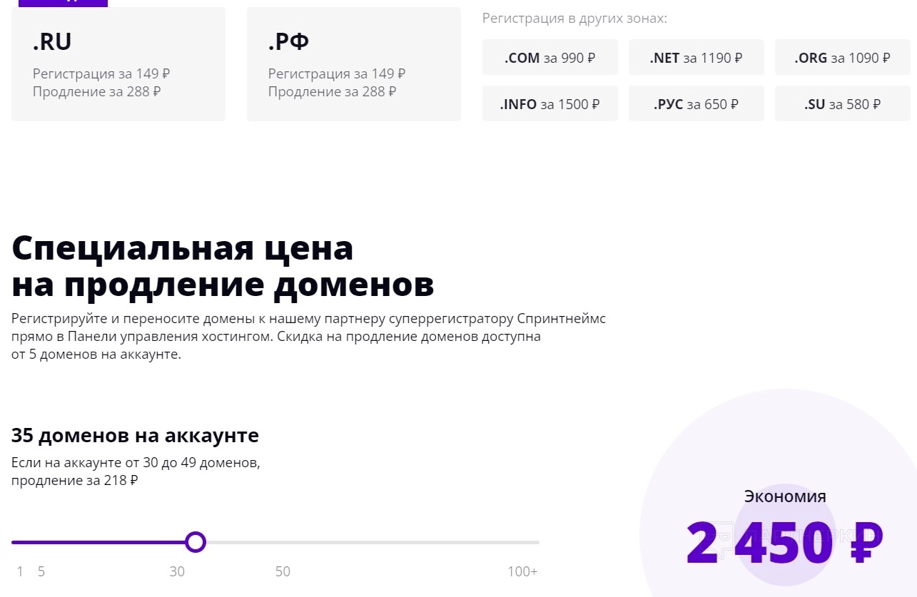 Сервис предоставляет регистрацию домена от 149 руб., плюс периодически предлагаются спецпредложения. Например, при регистрации домена — хостинг в подарок на определенное время. Ежегодное продление домена по цене выше, чем регистрация: расценки начинаются от 288 руб.