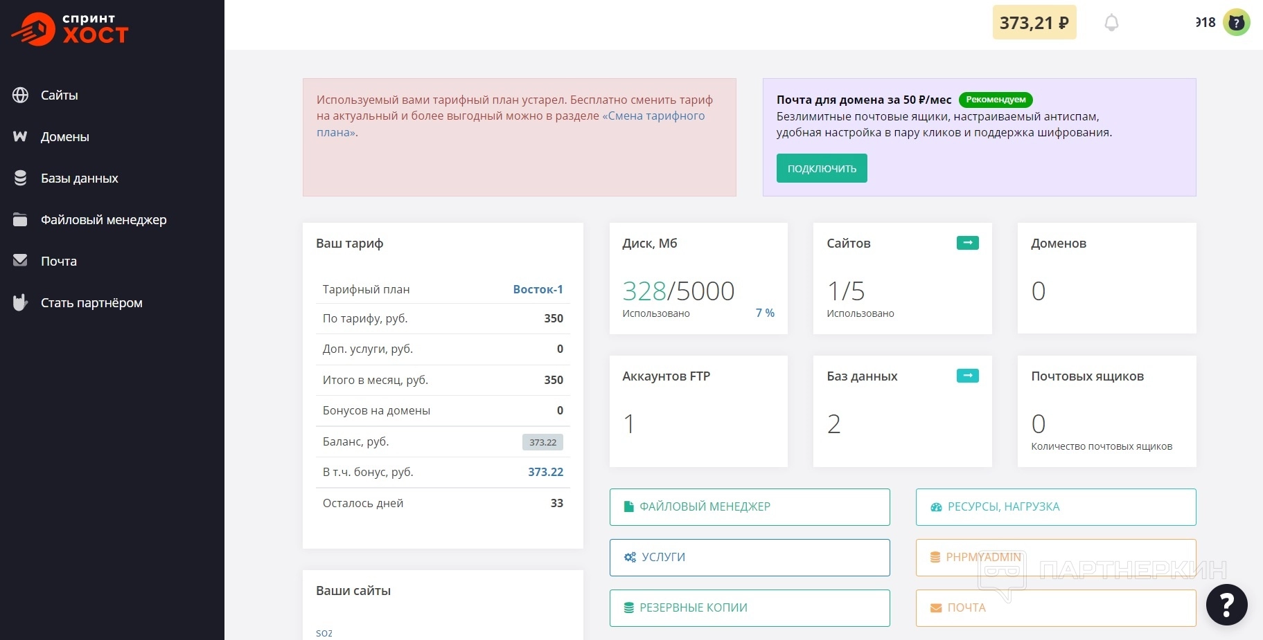 На главной странице личного кабинета можно видеть информацию о балансе и тарифе, о сайтах, используемом и свободном месте на диске, доменах, базах данных, аккаунтах FTP.