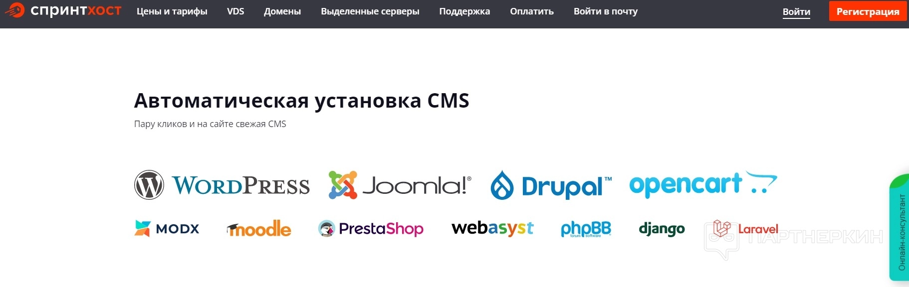 Sprinthostпредлагает быструю установку CMS в один клик. После регистрации на хостинге можно сразу заниматься созданием сайта. Можно установить Joomla, WordPress, Drupal, Битрикс, MODx, UMI.CMS.