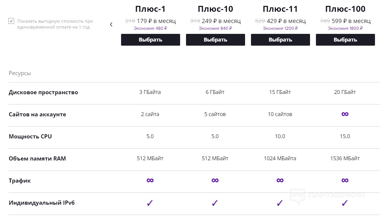 - Хостинг . Тарифы начинаются от 179 руб. в месяц (при оплате за год). Они различаются между собой по количеству места на диске, доступном количестве сайтов, ресурсами, по мощности CPU, объему памяти RAM. Например, на самом недорогом тарифе «Плюс-1» предоставляется 3 Гб на диске для 2 сайтов, 1 базовый веб-сервер.