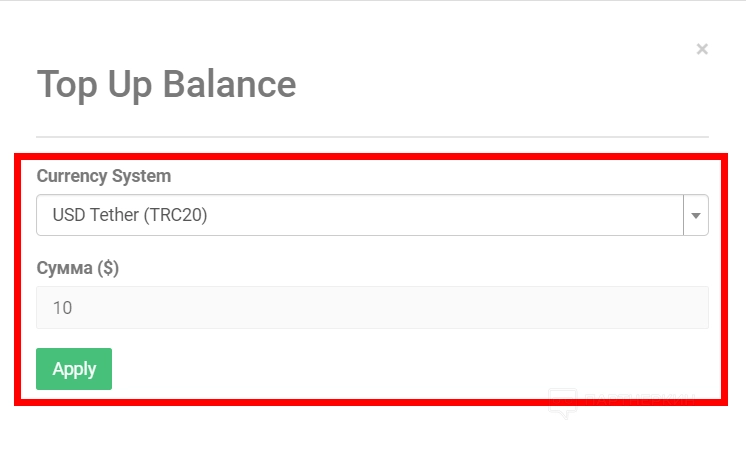 - Дальше выберите способ пополнения и необходимую сумму. Нажмите на кнопку Apply. Следуйте подсказкам платежной системы.