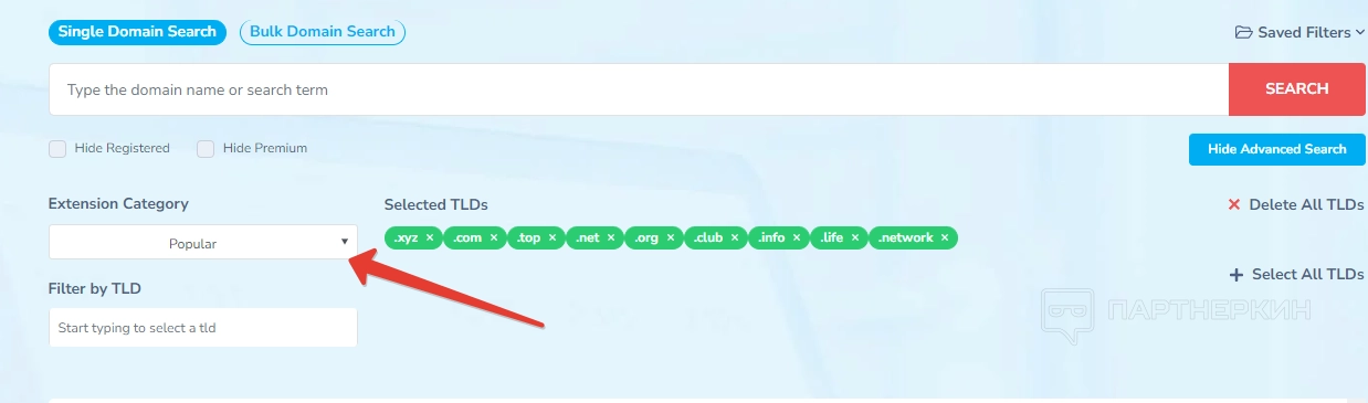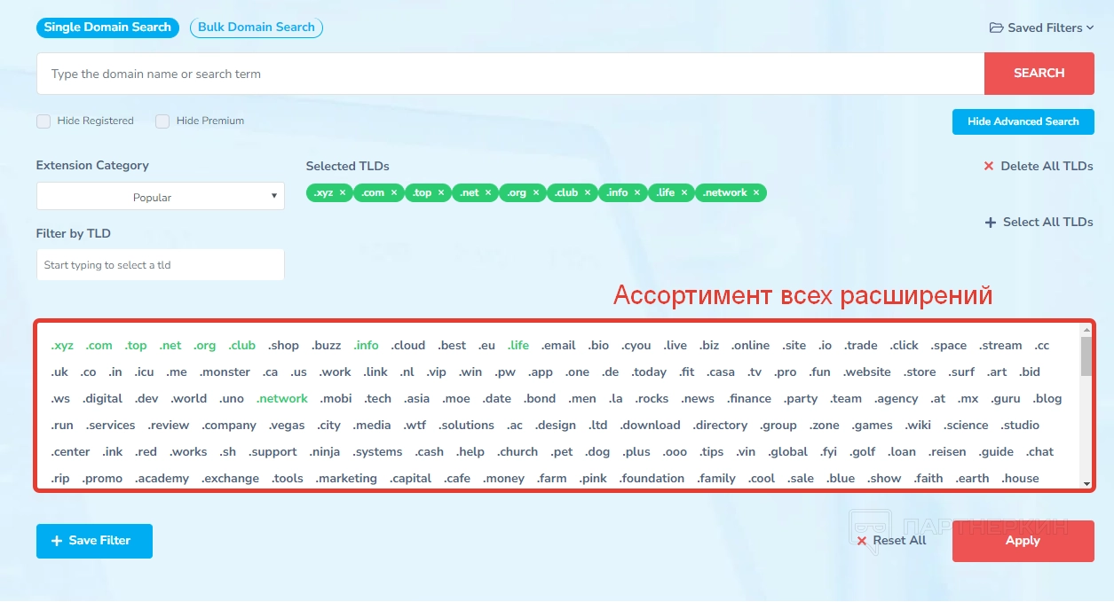 Самое же приятное, что в форме предусмотрен фильтр, позволяющий отбирать доменные расширения по категориям: