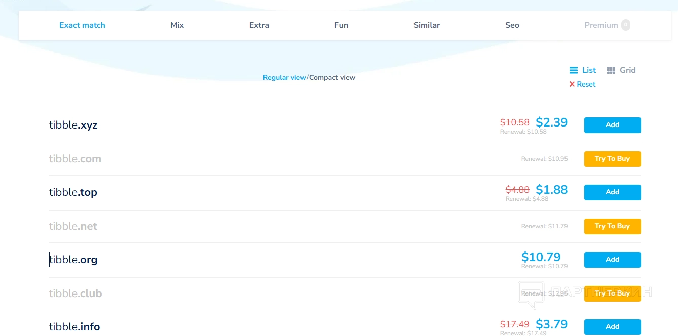 Через несколько минут загрузится страница, где будут все подходящие под выбранные параметры доменные имена. Вебмастеру останется лишь выбрать необходимый вариант, нажать на «Add» и оплатить заказ.