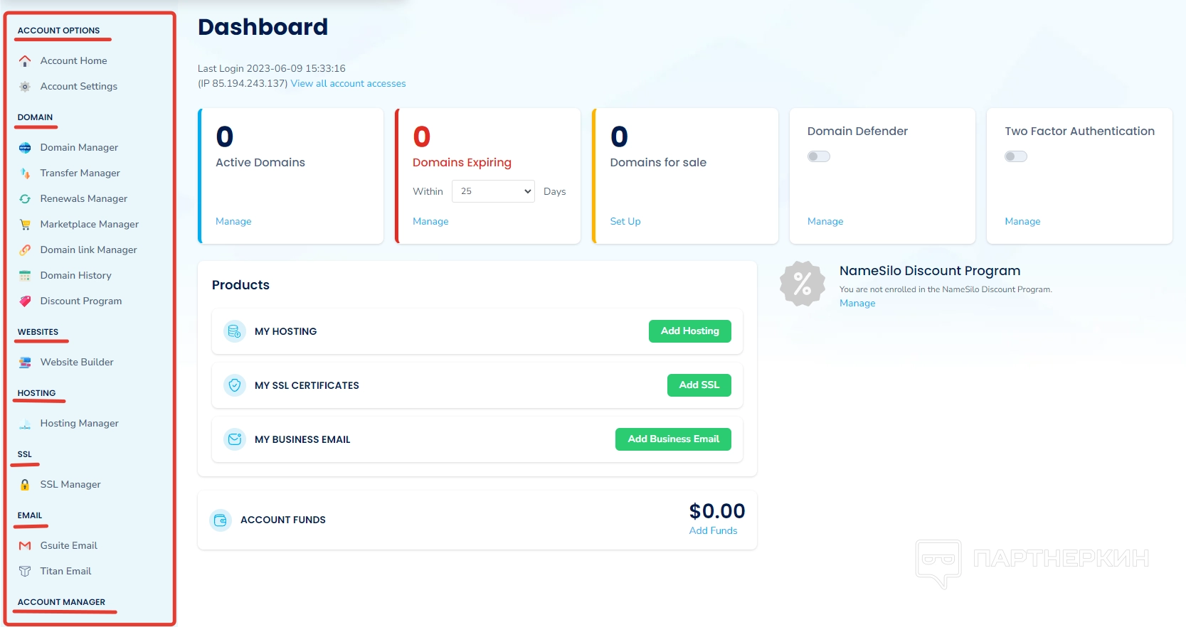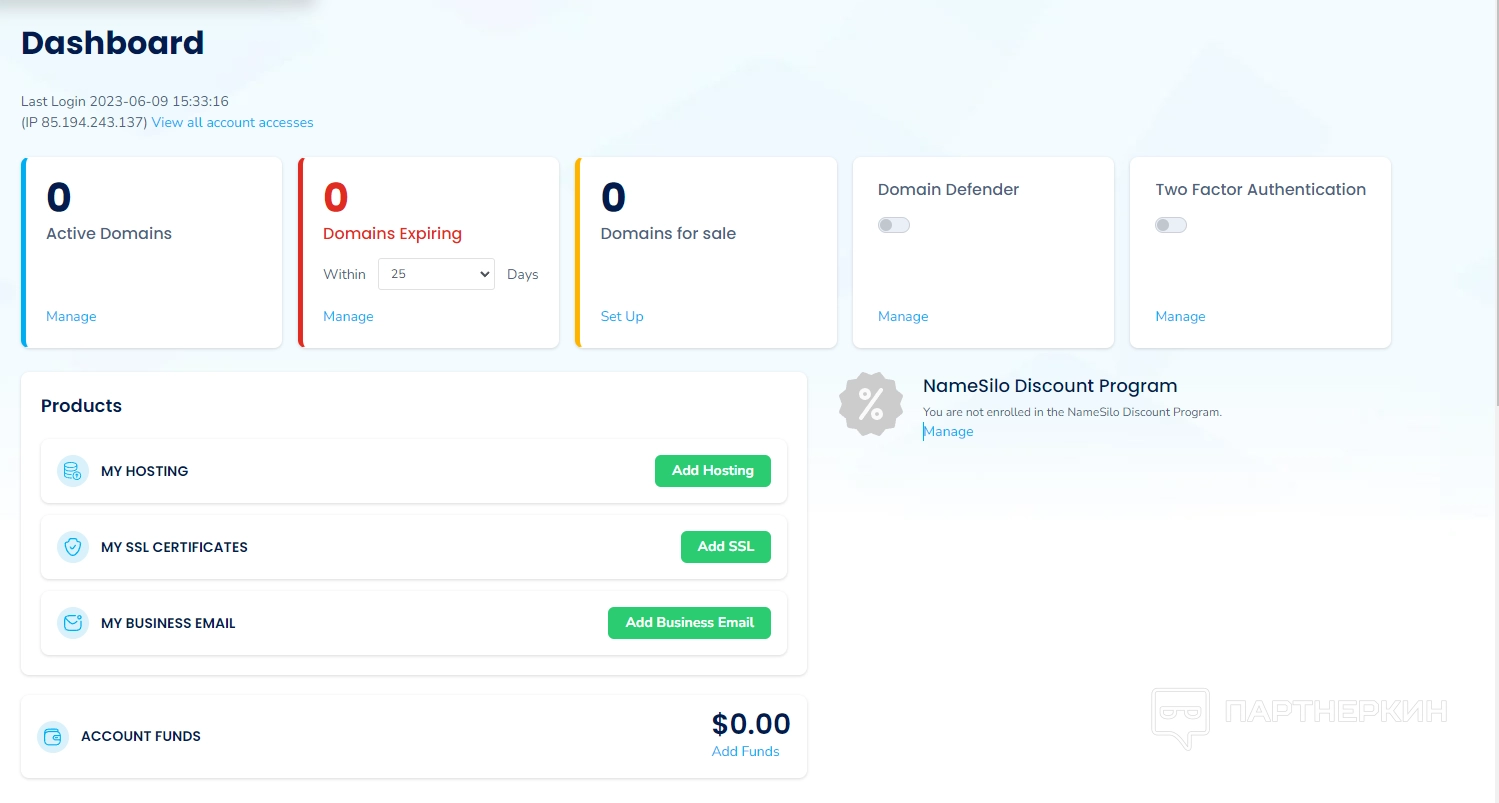 После регистрации вебмастер попадет на стартовую страницу личного кабинета, где будет отображаться сводная информация по аккаунту. Здесь можно найти такие данные, как количество активных доменов, выставленные домены на продажу, срок действия доменов, защита, двухфакторная аутентификация и т.д. Ниже предложены популярные продукты. Под ними отображается текущий баланс.