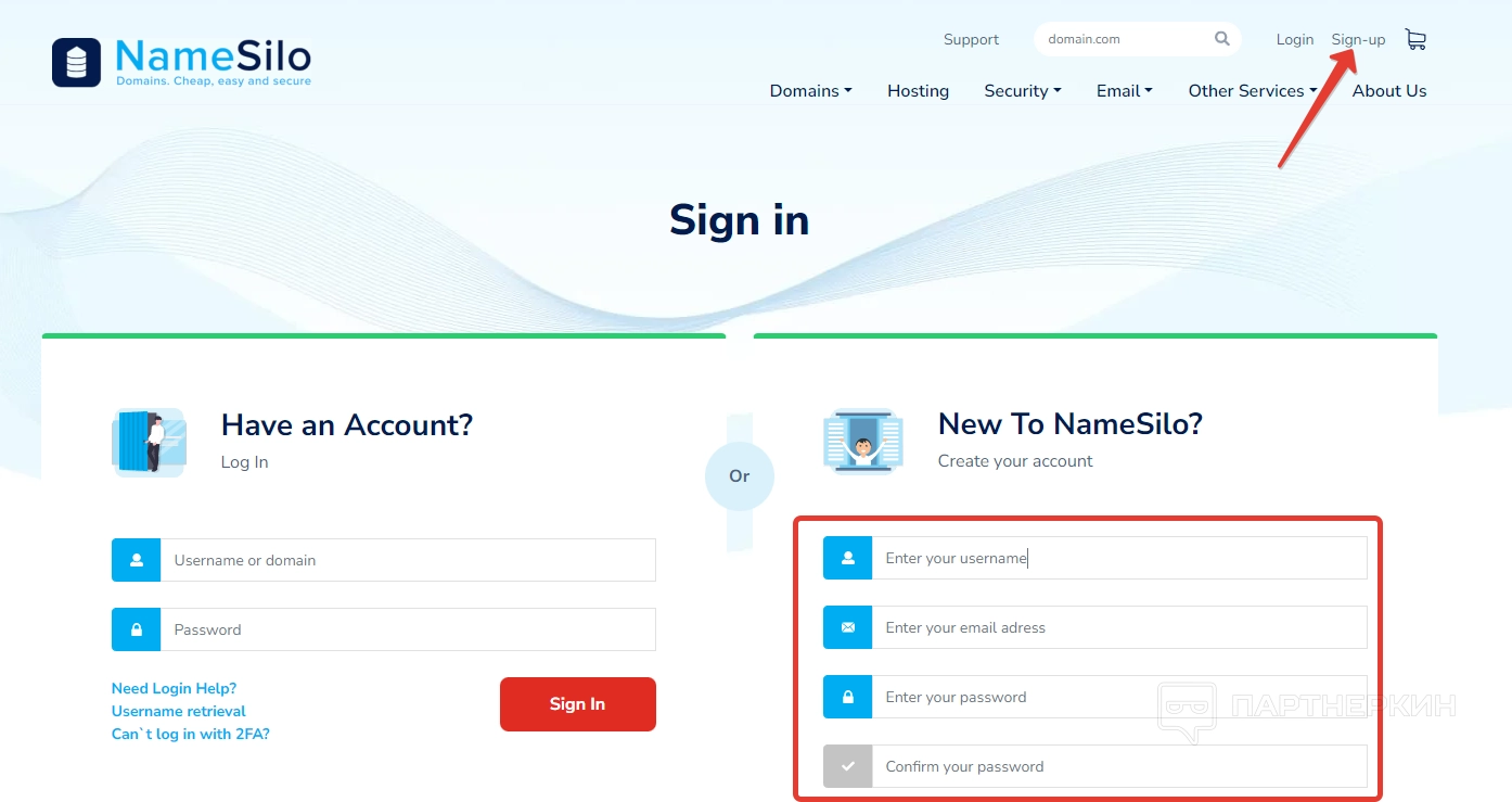 Искать доменные имена и мониторить цены рынка можно и без учетной записи. Но если пользователь хочет приобрести домен, придется зарегистрироваться. Регистрация осуществляется довольно просто:
