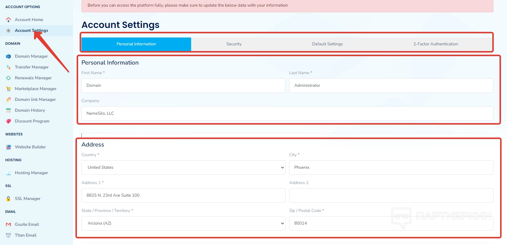 Прежде чем приобрести какой-либо продукт, владелец аккаунта должен заполнить свою анкету. Для этого переходим во вкладку «Account Settings» и заполняем все формы, которые видим на экране.